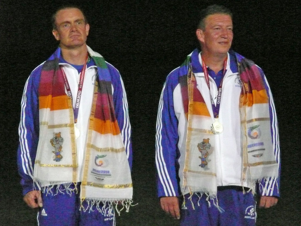 So the Singles final went ahead – not, of course, without electronics problems – and Parag emerged in a clear first there, with Jim Corbett in second and David Calvert in third places, provisionally. Angus had a 69 and Ian a 67. Final placings saw Angus in seventh and Ian in 15th. Meantime the Jury of Appeal was deliberating the vexed question of which protests/decisions should be upheld in the Pairs. Interestingly, none of the teams occupying draft medal s had been involved in re-shoots. As mentioned already, after six and a half hours, our Silver in the Pairs was confirmed, the Appeal Jury having set aside the previous decisions regarding the award of reshoots. Mind you, confirmation only came in the shape of Ian and Angus being called for the medal ceremony. At the end of the day, of all the reshoots awarded, only Ian’s in the Singles was allowed to stand as the backer confirmed that his target was not accurately recording the fall of shots passing through the actual target centre.